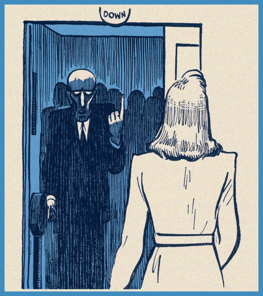 The elevator was very crowded, but she was about to squeeze her way inside — when a familiar voice rang in her ear. “There is room for one more!” it called. In terror, she stared at the operator.