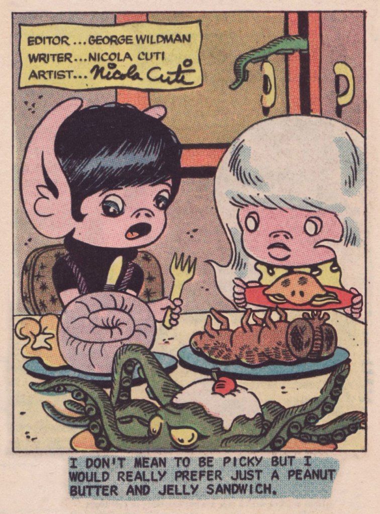 Nicola Cuti‘s Weirdlings was a charming little ‘filler’ gag page designed and drawn by him. This one was published in Haunted no. 14 (Sept. 1973, Charlton). I think the octopus, that appears to be still alive, would also prefer a good old PBJ sandwich.