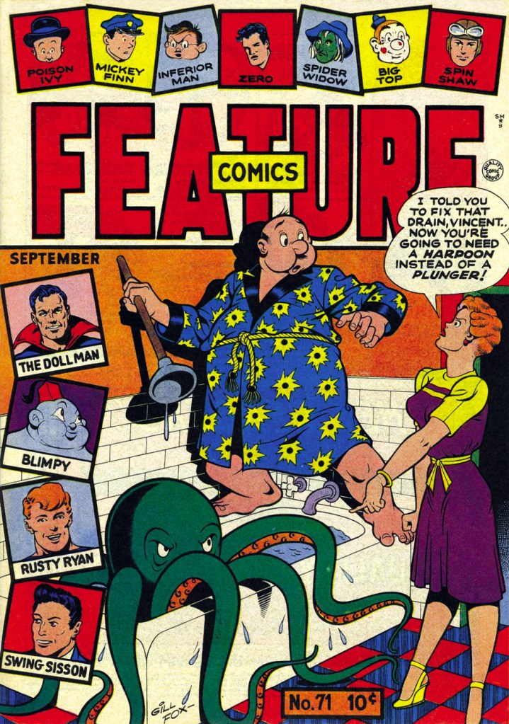 Feature Comics no. 71 (September 1943, Quality Comics). Cover by Gill Fox. The octopus-in-plumbing theme is an oldie-but-goodie; the undaunted housewife may yet regret her cavalier attitude towards the tentacled one, who probably wants to move in with his family.