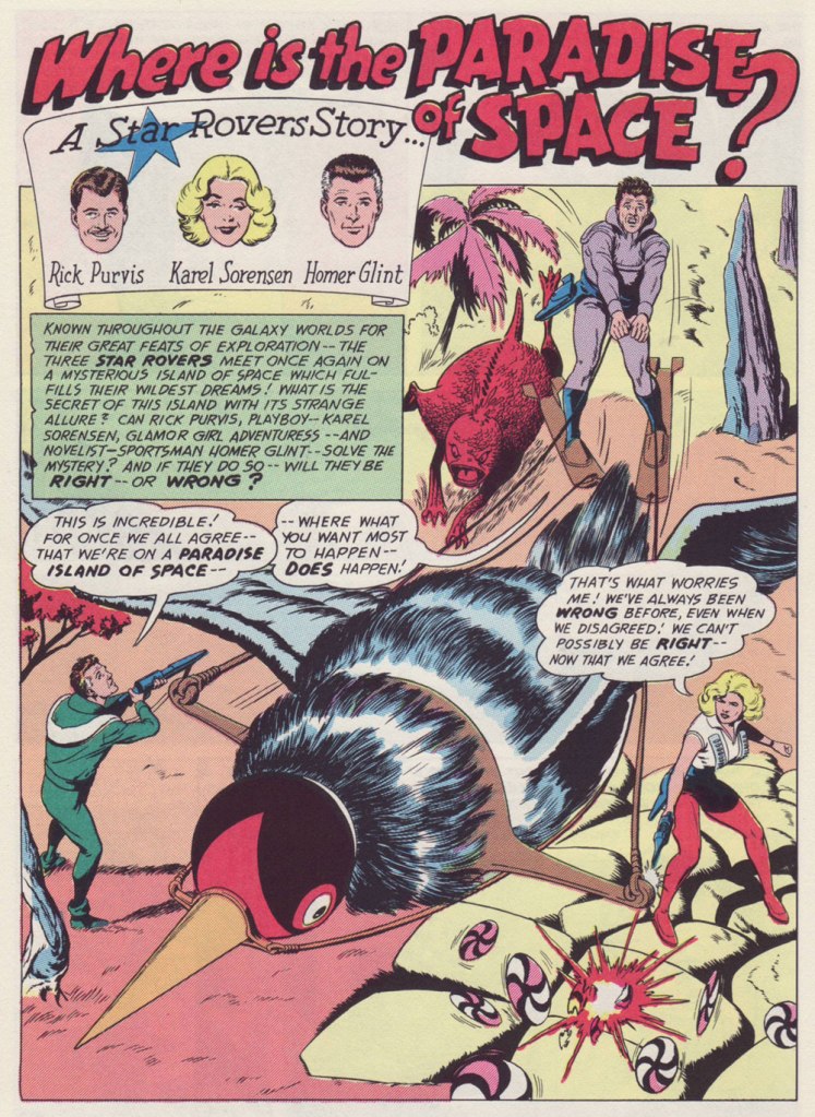 And now for a bit of context: The Star Rovers was a short-lived series that sporadically appeared in the back of DC’s Julius Schwartz-edited titles, mainly Mystery in Space, backing main feature Adam Strange.