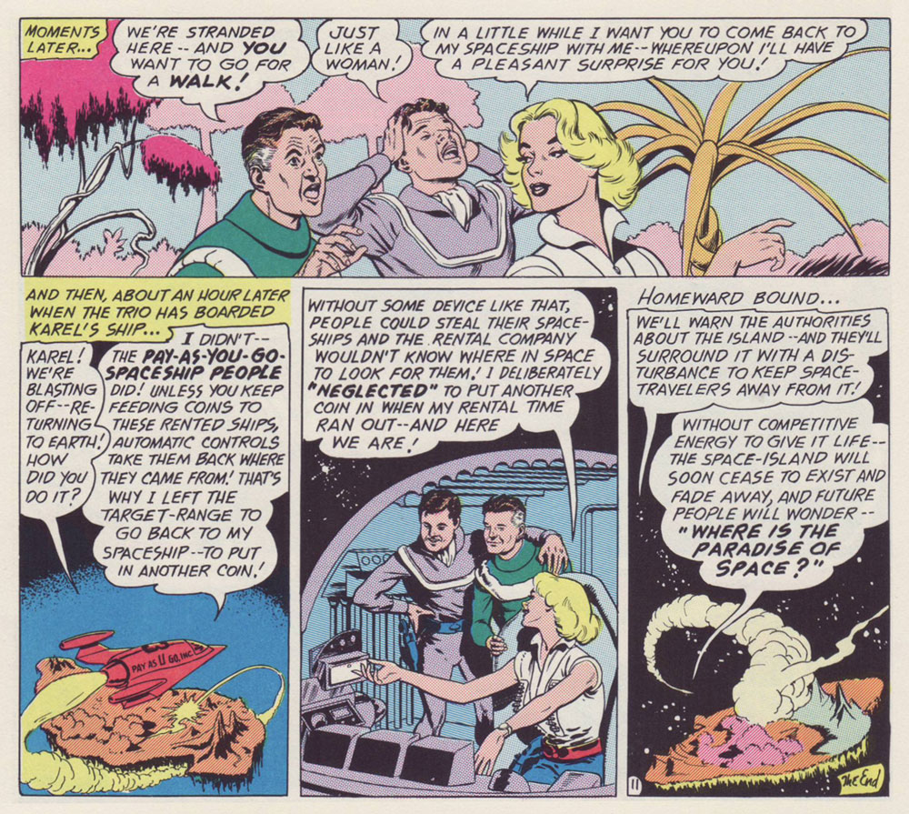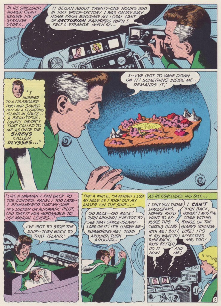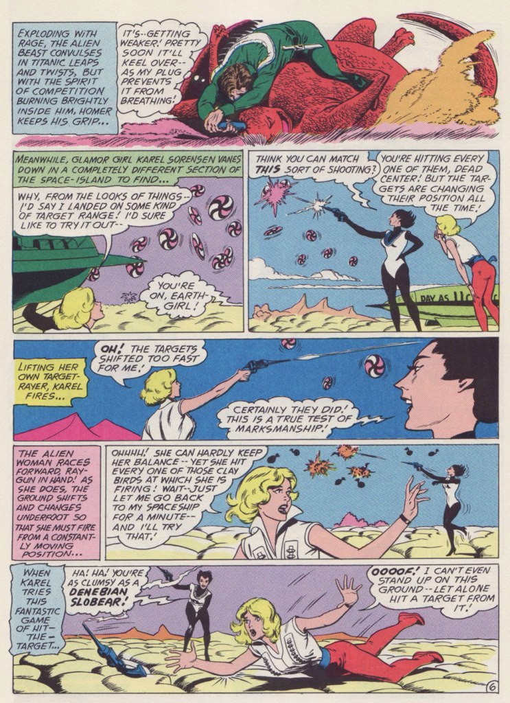 Why am I so fond of this particular story? It’s the little things: for once, a story in a Jack Schiff-edited title makes some semblance of adhering to scientific — or at least science-fictional — principles; here, Elias designed an alien race that, given their grumpy, unprepossessing mugs, would typically have been cast as villains, but instead turn out perfectly honourable; the story’s human protagonists give aid to strangers in need, never asking for a thing in return: no Zarkan mineral rights, no salacious dirt on J’onn J’onzz, just selfless dedication to doing the right thing and the satisfaction of averting a crisis. How refreshingly old-fashioned, a cooling balm for these harrowing times.