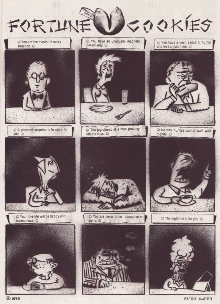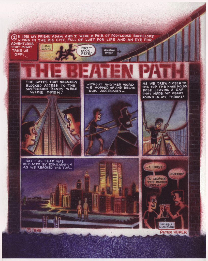 I first encountered American artist Peter Kuper (b. 1958) through Mad’s Spy vs. Spy feature, which he took over as scripter and illustrator with Mad Magazine no. 356 (April 1997). At that point, I had only seen creator Antonio Prohías‘ take on that strip, and I was impressed with Kuper’s style and energy.