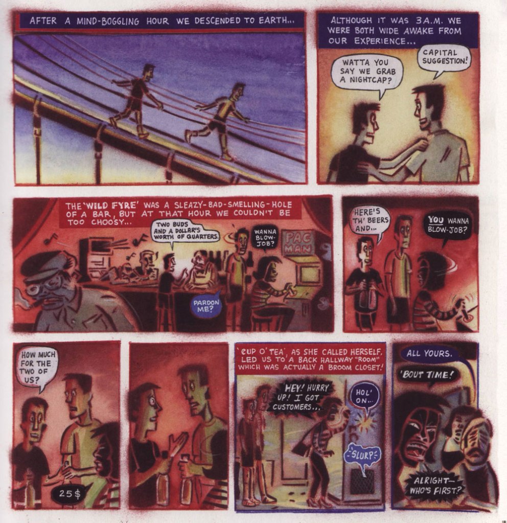 One of the more memorable stories of Drawn to New York is the following three pager, following the nocturnal adventures of Peter and his friend Adam as they scale a bridge and awkwardly navigate the social etiquette involved in engaging the services of a blowjob prostitute: