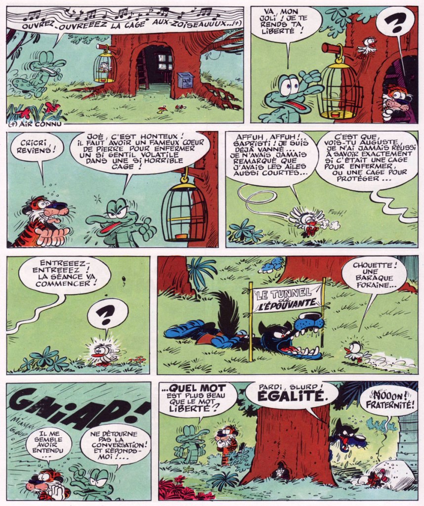 Maltese (named, indeed, after Dashiell Hammett’s famous novel… or rather its John Huston-helmed cinematic adaptation) created in 1967 for the Italian magazine Sgt. Kirk… saddled with a modest print run of 3000… and rather soon cancelled owing to low sales! There, Corto turned up — as a minor player — in a tale entitled Una Ballata del Mare Salato (“A Ballad of the Salt Sea”). Corto’s peregrinations then followed their tortuous course in French bédé weekly Pif Gadget from 1970-73, where the strip mostly baffled — or even enraged — readers but was tirelessly championed by the enlightened editorial team. In his Prix Goncourt-winning biography*, Hugo Pratt, trait pour trait, Thierry Thomas states: « With each new episode, the magazine received letters from readers who couldn’t make head nor tail of it, and demanded Rahan, nothing but Rahan. » Clearly, the world wasn’t ready for Corto… but that acceptance would gradually arrive, at least in the non English-speaking world**.