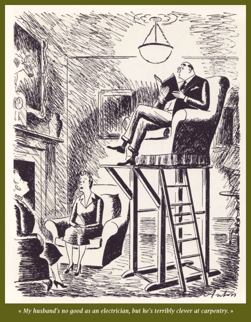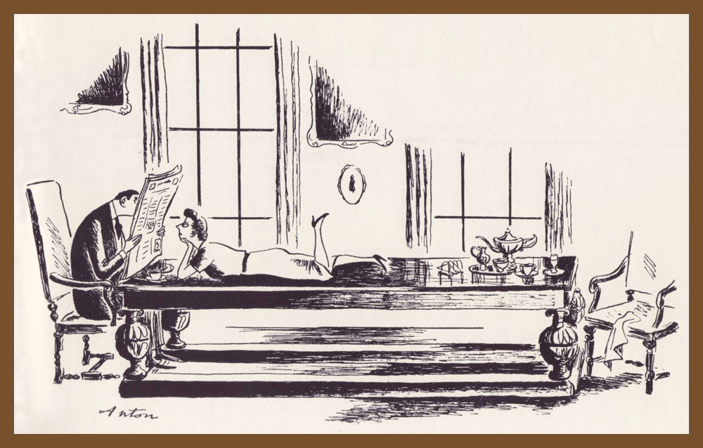 I didn’t know this until writing this post, but delightfully Raymonde was friends with WOT favourite Gerard Hoffnung (see co-admin RG’s posts Gerard Hoffnung’s Constant Readers and Off to the Isle of Cats — and Back by Teatime!), whom he met at the Harrow School of Art (a subdivision of University of Westminster) in 1944, when RR was but 15. The two became lifelong friends, with Hoffnung, then a junior tutor (on his way to becoming a schoolmaster) a mere four years his senior, playing the role of Raymonde’s mentor. This friendship was cut abruptly short by Hoffnung’s premature death, so they were not able to re-enact Simon & Garfunkel’s Bookends, alas. I wasn’t able to find the exact source of this quote, as various websites just parrot the same paragraph over and over, but it seems that Raymonde was nearly expelled after adding funny captions to one of Hoffnung’s instructional drawings, a story hopefully as true as it is hilarious. Hoffnung (never bereft of a sense of humour) came to his defense and argued that this act was a sign of talent.