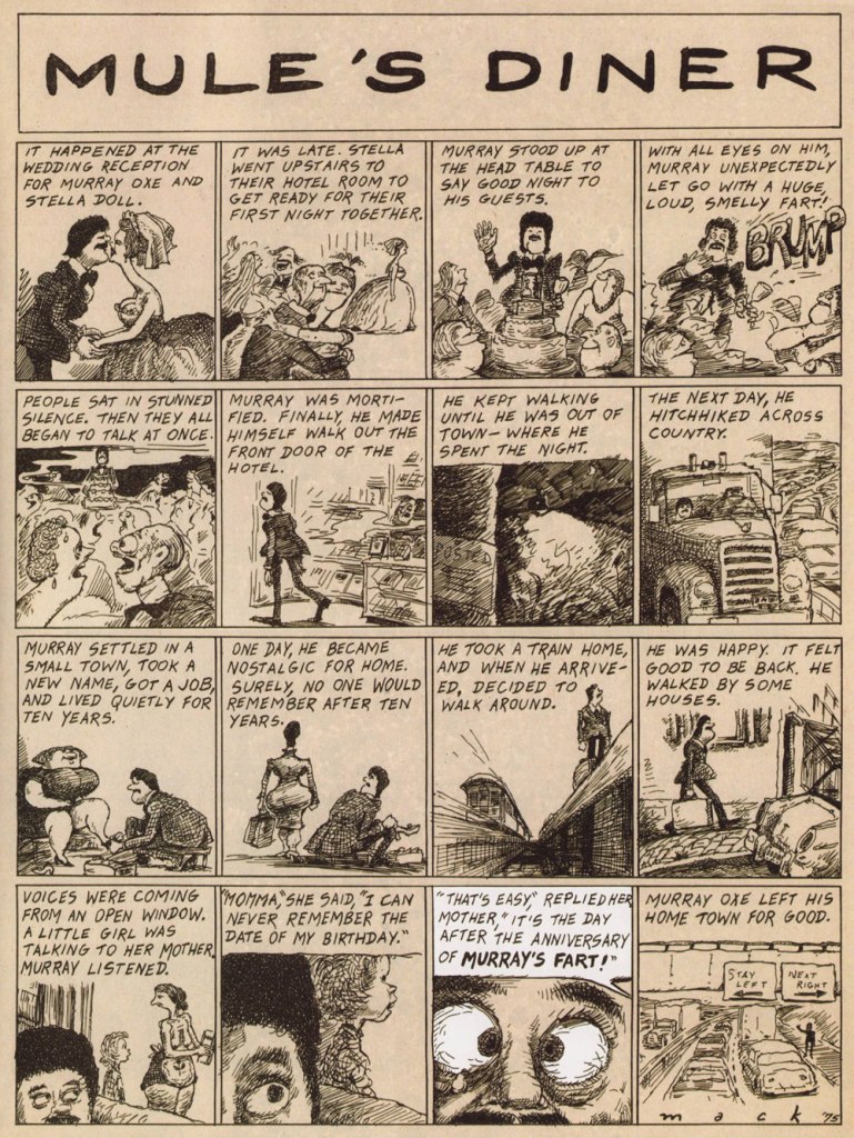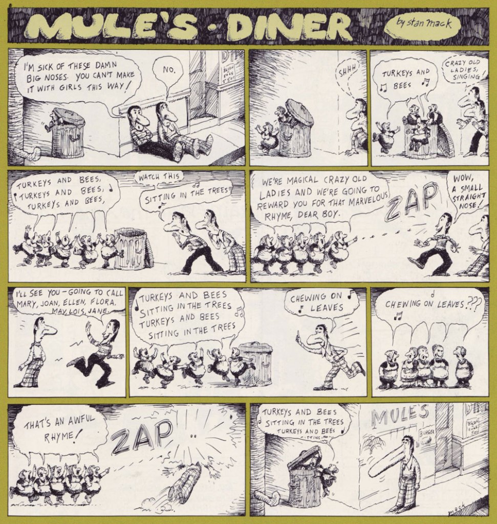 While Stan Mack is most celebrated for his impressive comics reportage (an area explored in this previous post), I’m just as taken with his earlier endeavour, the surreal Mule’s Diner, sporadically published in the Lampoon during the magazine’s heyday (the first half of the 1970s).