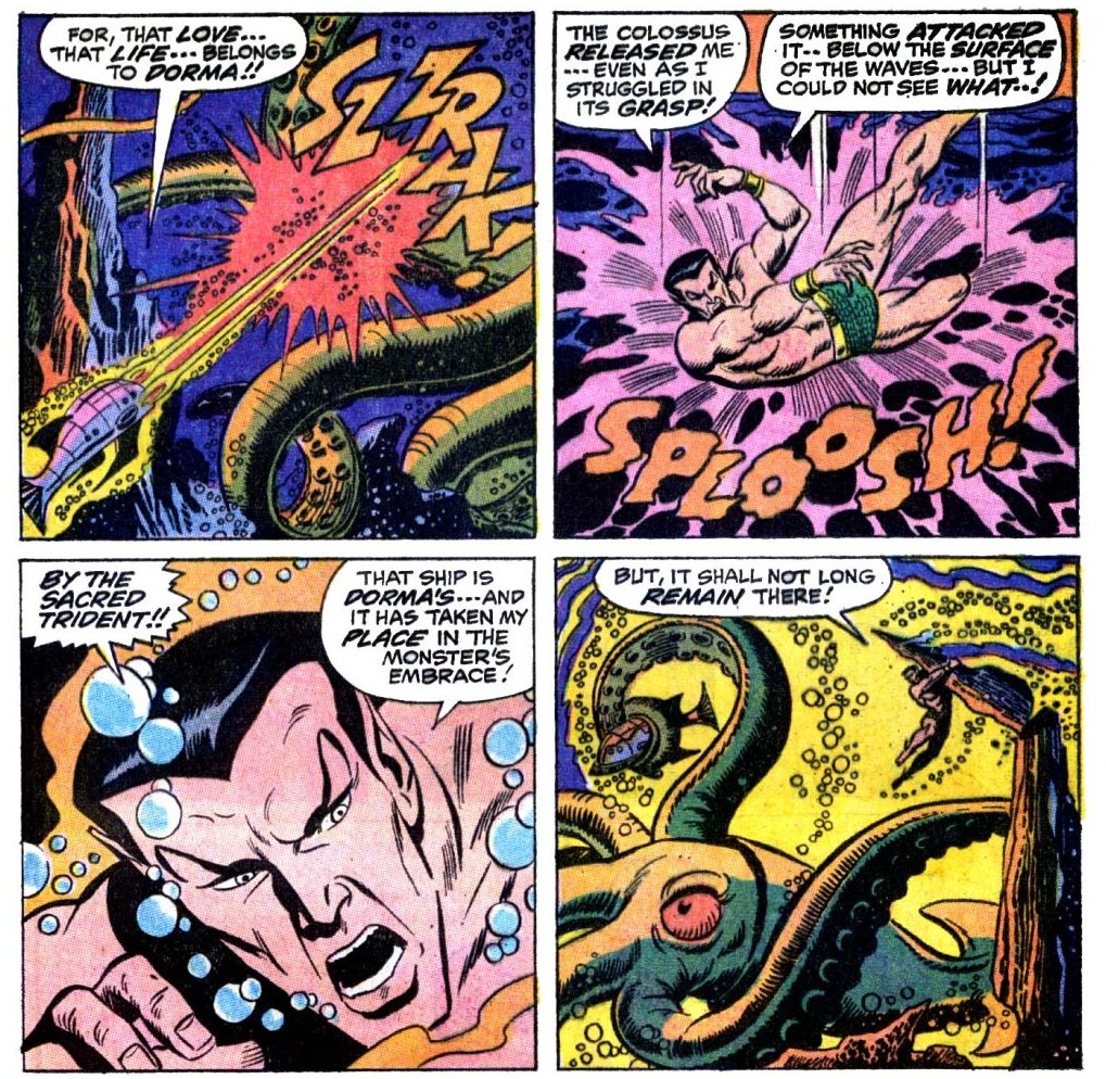 A page from “When Wakes the Kraken!”, scripted by Roy Thomas, pencilled by Sal Buscema and inked by Mike Esposito, printed in Sub-Mariner no. 27 (July 1970):