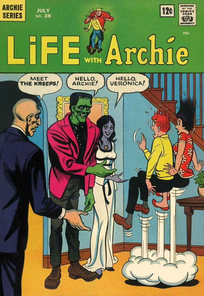 This is Life With Archie no. 39 (July 1965, Archie); cover, again, by Mr. White. The previous year had seen the TV arrival of The Addams Family and its imitators, The Munsters. So what’s one carbon copy more or less?