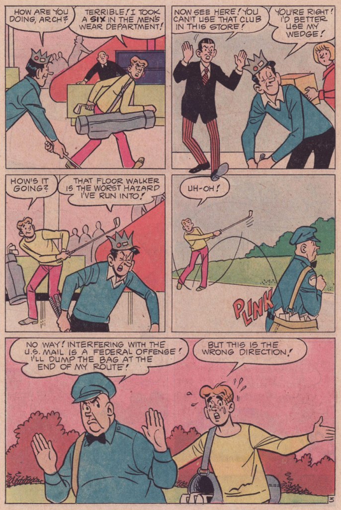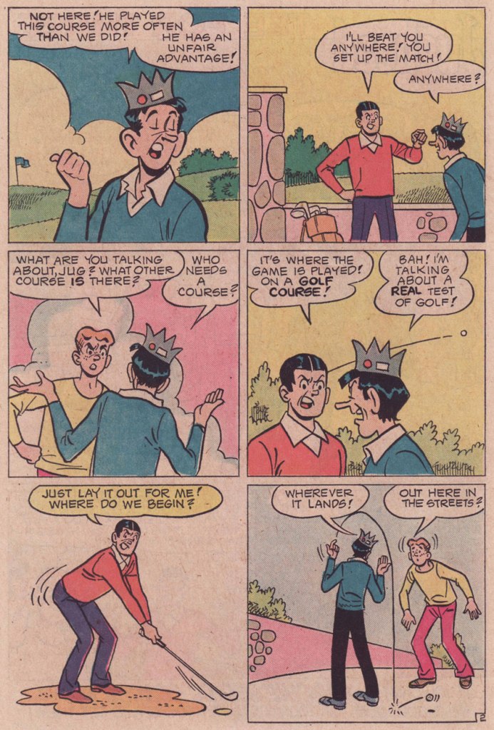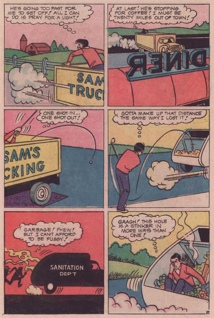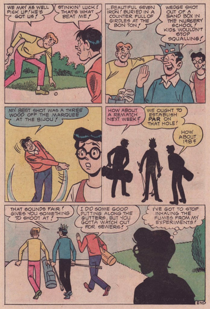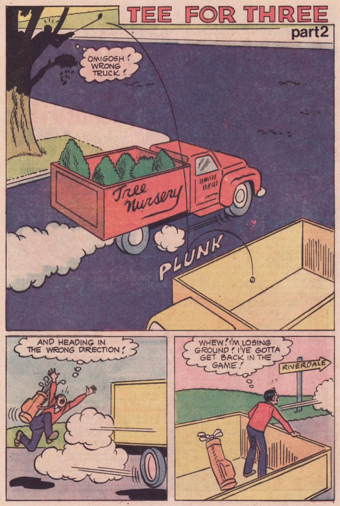I’ve long wanted to showcase one of Samm Schwartz‘s Jughead stories on this blog, but always hit the same snag: which one? Not too long ago, while revisiting my trove of 1970s issues, I came upon just the specimen. Tee for Three appeared in Jughead no. 247 (Dec. 1975, Archie). I’ll spare you the hideous-as-usual Stan Goldberg cover.