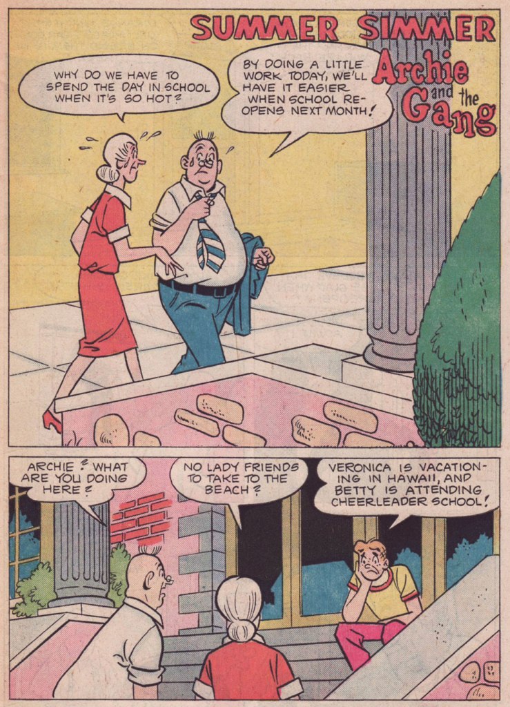 « Summer Simmer » first appeared in Archie’s TV Laugh-Out no. 35 (Nov. 1975, Archie). Scripted by George Gladir, this story has the distinction of not particularly striving to be funny, instead focusing on character and situation.. which is totally distinct from the all-too-frequent straining for laughs and failing Archie blueprint. This sort of outlier is what makes the search worth the bother.