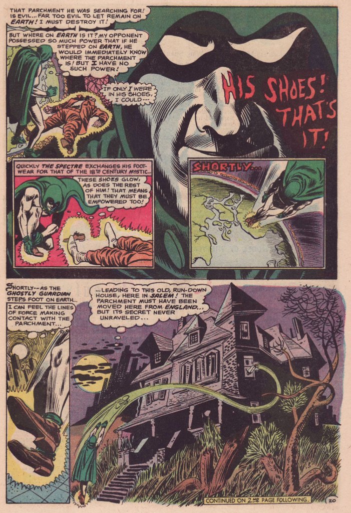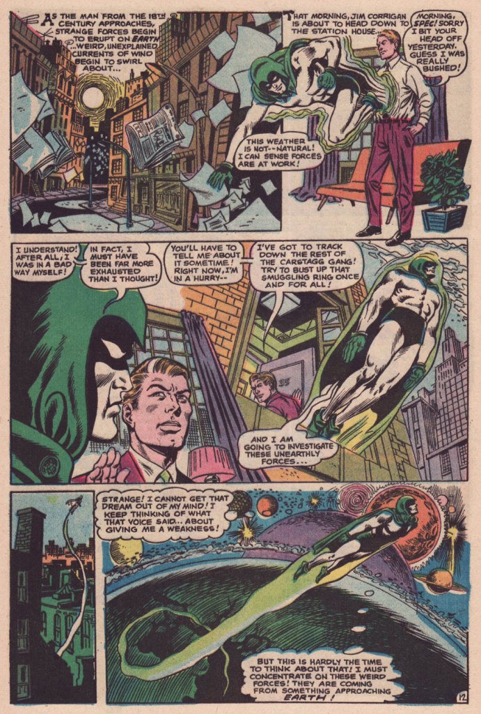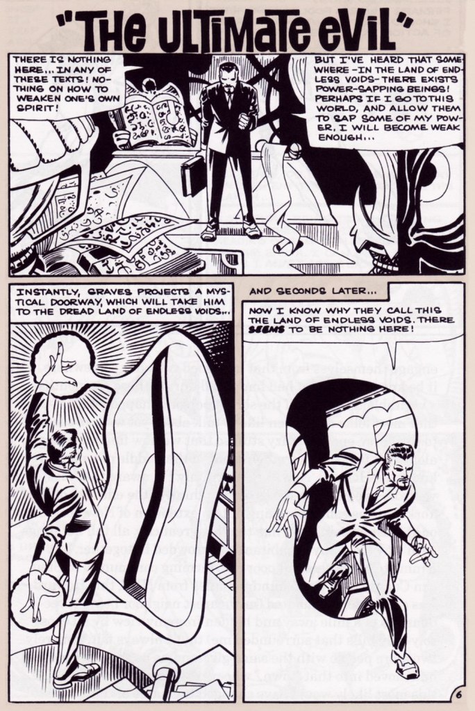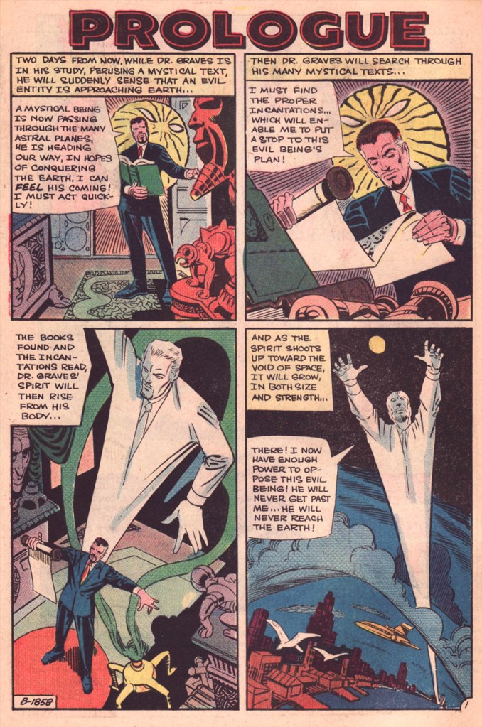 « Boom! I was into it, writing this story nearly as fast as I could type. Of course, to in effect have Graves play the role of the Spectre, I could see no way around making certain alterations to my protagonist’s makeup, making him far more mystically powerful than he had ever before seemed, more like Marvel’s Doctor Strange than anyone else…