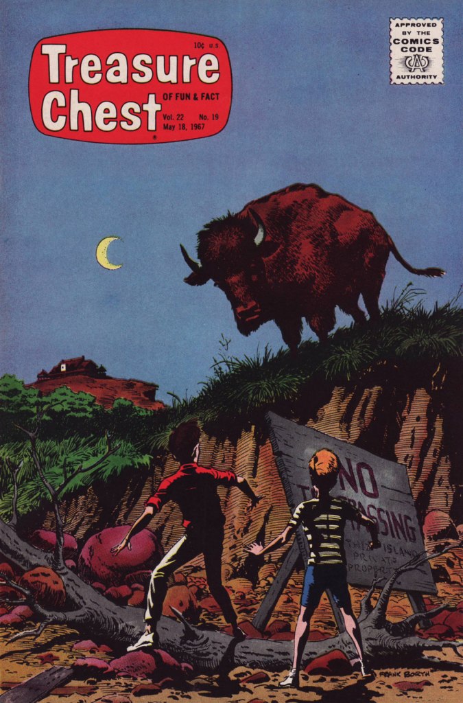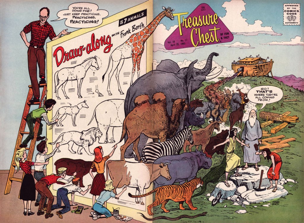 Then, at the close of the 1940s, he began a long association with Catholic publisher George A. Pflaum, chronicling (among others) the rollicking adventures of one Frumson Wooters, aka The Champ, a stereotype-bucking chubby kid who’s at times scatterbrained and clumsy, but also wise, determined, resourceful, and humble to boot. Written by Captain Frank Moss and radiantly illustrated (and later, also scripted) by Borth, the feature ran for two decades in Treasure Chest of Fun and Fact, a publication distributed to parochial school students between 1946 and 1972 and generally avoided like any of the Ten Plagues of Egypt by your average comic book fan, but — wouldn’t you know it? — chock full of excellent work by the likes of Bernard Baily, Fran Matera, Bob Powell, Reed Crandall, Joe Sinnott, Graham Ingels, Joe Orlando, Murphy Anderson, Jim Mooney, Marvin Townsend, Paul Eismann… I’ll stop now.