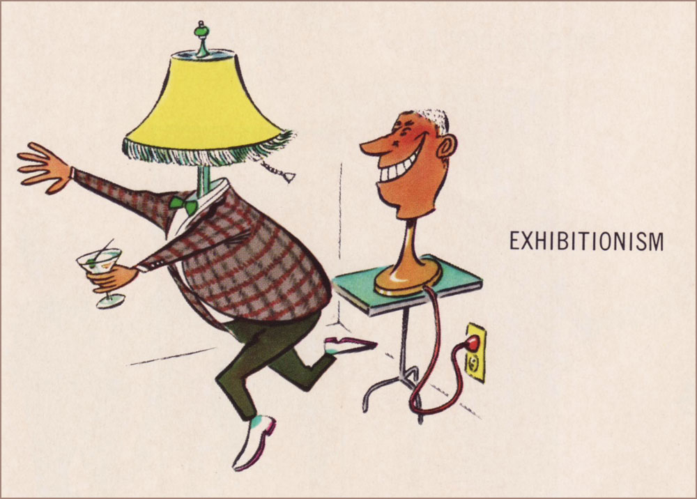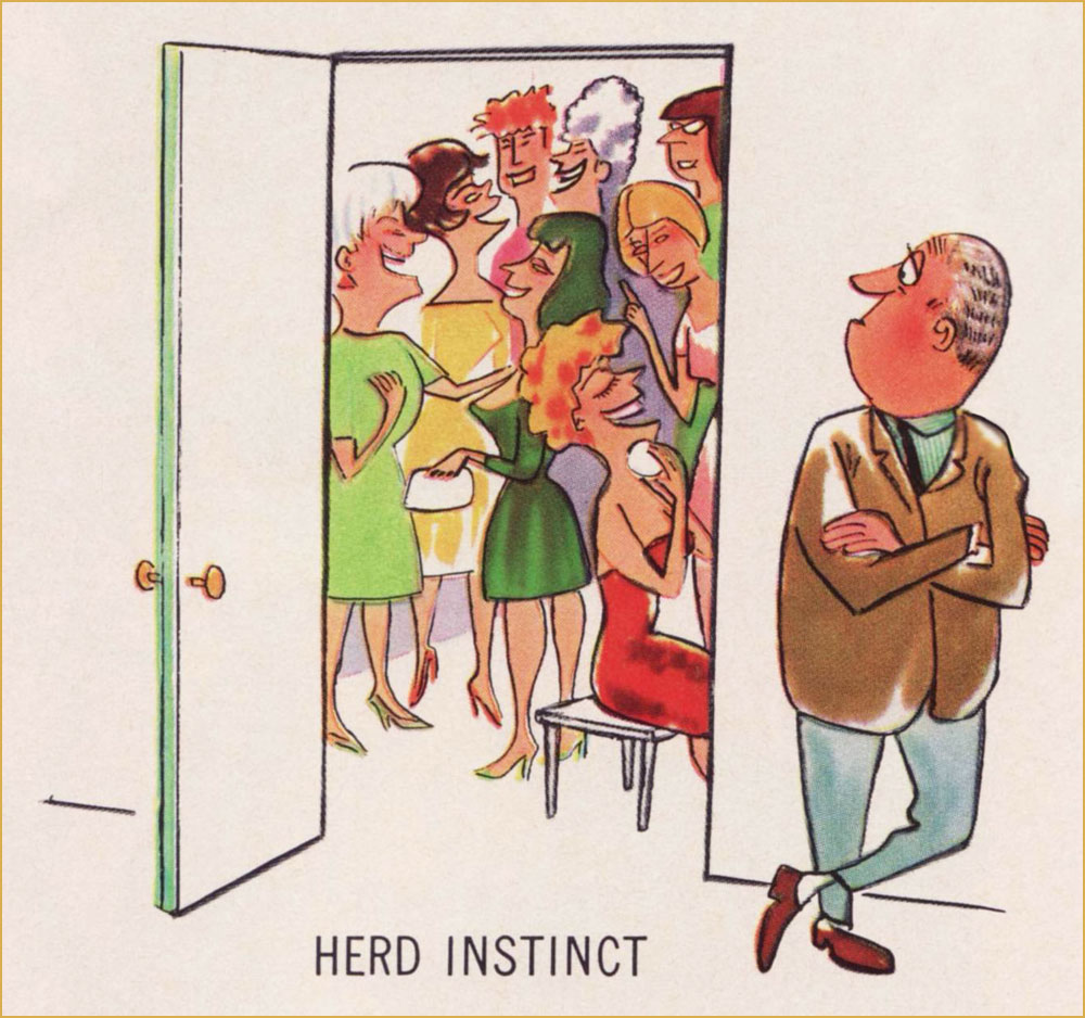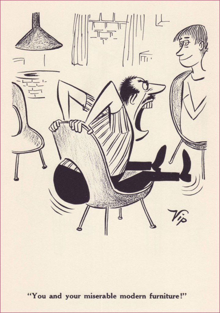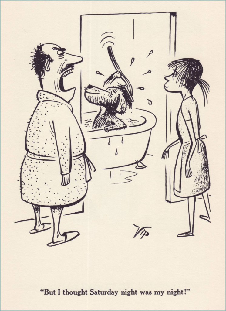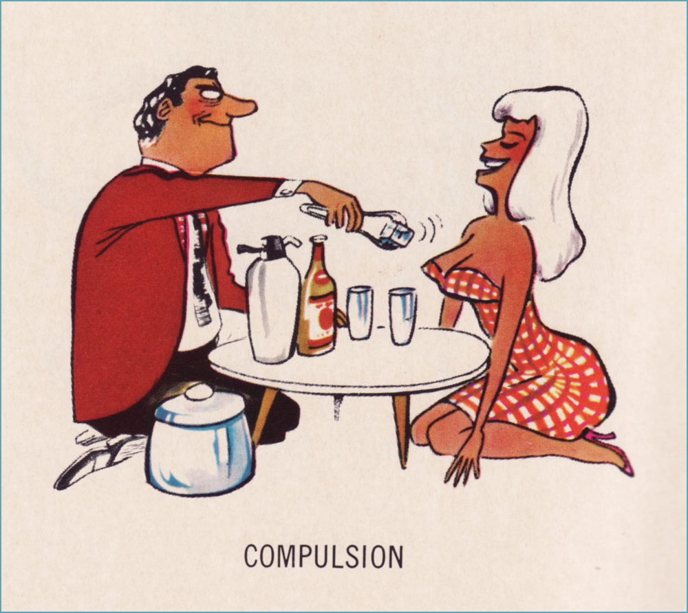 Virgil Franklin Partch (1916-1984), mostly known as VIP, is legendary, and I’m not one to use this description lightly. One can spot his work a mile away by his surreal sense of humour and a kinetic, unhinged-yet-clean style. He was also prodigiously prolific, thegag-man of his day. VIP not only wrote and drew tons of cartoons for magazines in the 40s and 50s (Collier’s Magazine, True, the Man’s Magazine, The New Yorker, Playboy…) but also provided glorious art for LP covers; illustrated other people’s books, as well as releasing collections of his own cartoons with invariably entertaining titles (The Wild, Wild Women; Cork High and Bottle Deep; Relations in Strange Locations, etc.). His doodles also adorned merchandise – my favourite being, of course, cocktail glasses!