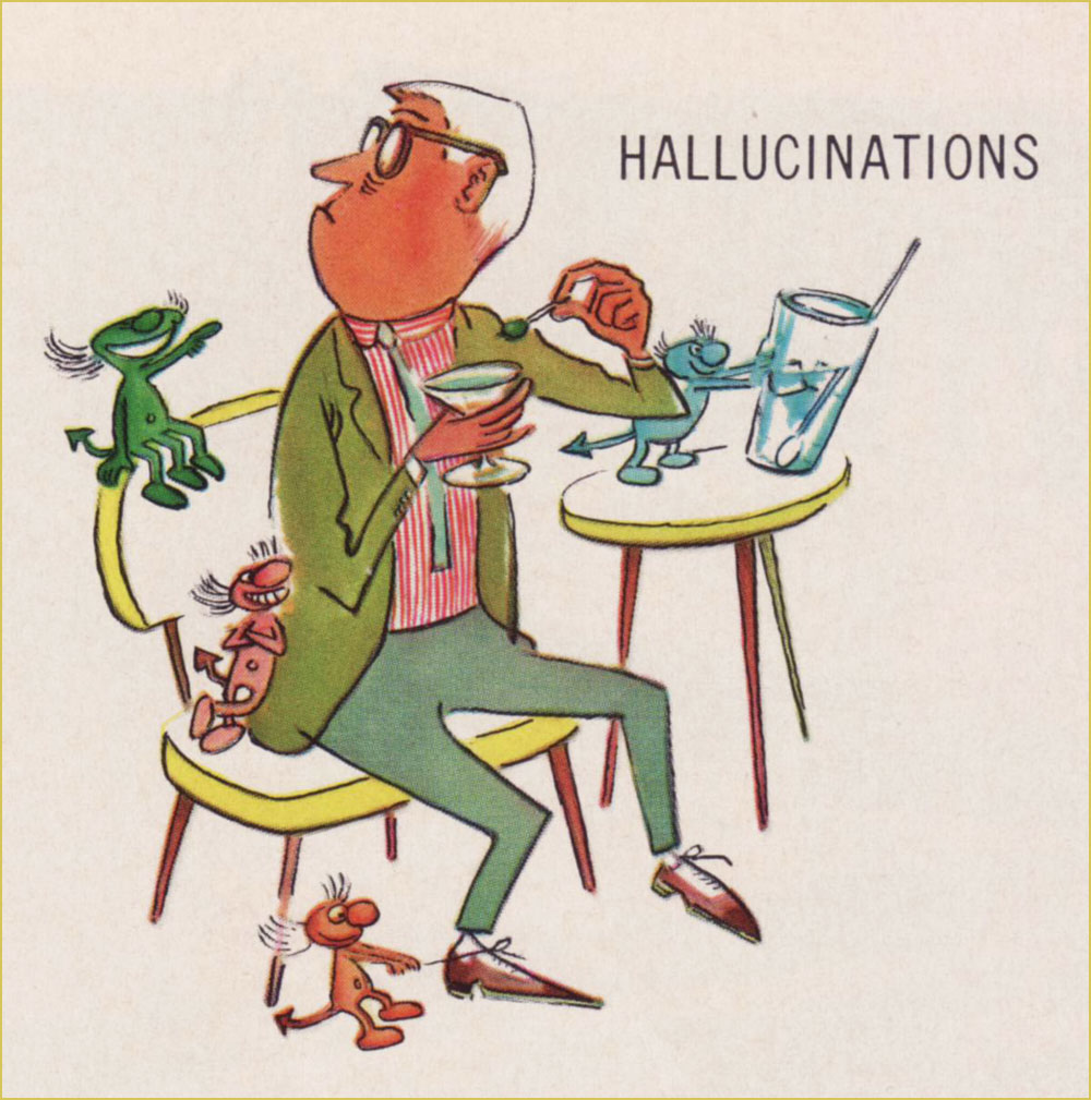Detail from cover of the True Magazine Bar Guide paperback (1950). « Flinging himself into the study of this challenging matter, Vip left no glass unturned, no drink unbottled, no bottle undrunk, etc. Leaving statistics to the statisticians, analysis to the analysts, facts to the factories, data to the dataist, Vip went straight to the sources. Often he worked until the wee small hours of the night, crawling home exhausted from his studies, numb with the impact of startling discoveries, quivering and all but incoherent with surmise… » Quote from the introduction to Bottle Fatigue (1950).