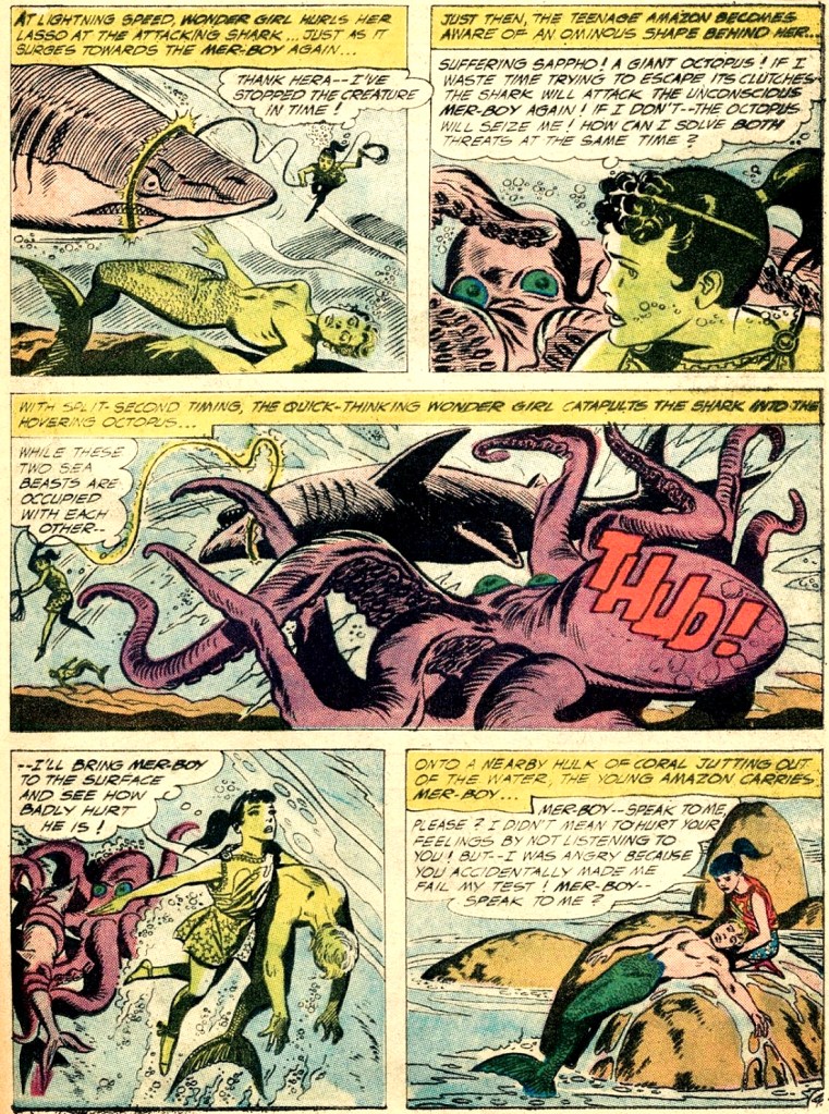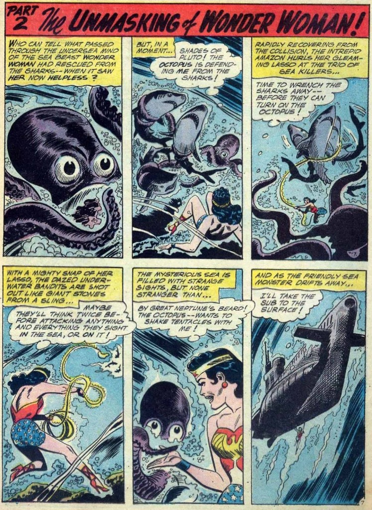 After Wonder Woman rescues the octopus from some bloodthirsty sharks, they become friends! Perhaps because for once, no suitor is involved.