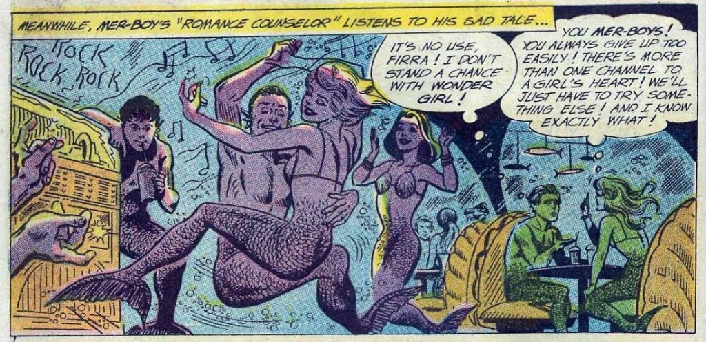 The pretty mermaid’s suggestion is to make Wonder Girl jealous by inviting her to a party and then proceeding to ignoring her altogether. Monumentally stupid? Yes. Is Firra being obtuse on purpose? It’s very possible. Remove the fantastical monsters and the whole superpowers thing, and these stories will read like a hackneyed romance comic.