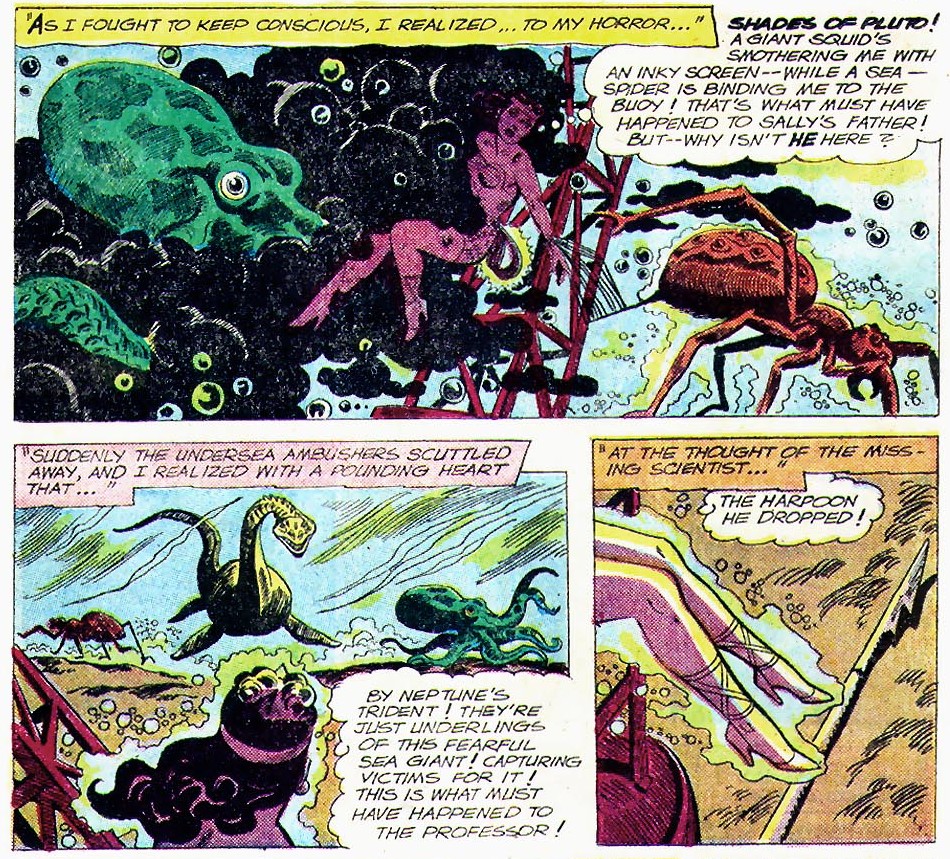Today’s batch of tentacles all come from the heads and hands of one team: scripts by Robert Kanigher, pencils by Ross Andru and inks by Mike Esposito. I make no secret of my dislike for Kanigher scripts when there are women involved*, but the Andru & Esposito team deliver some very nice art to go with the dubious plotting. Besides, we are concentrating on tentacles… though I can’t promise an occasional plot-jab. 🙄
